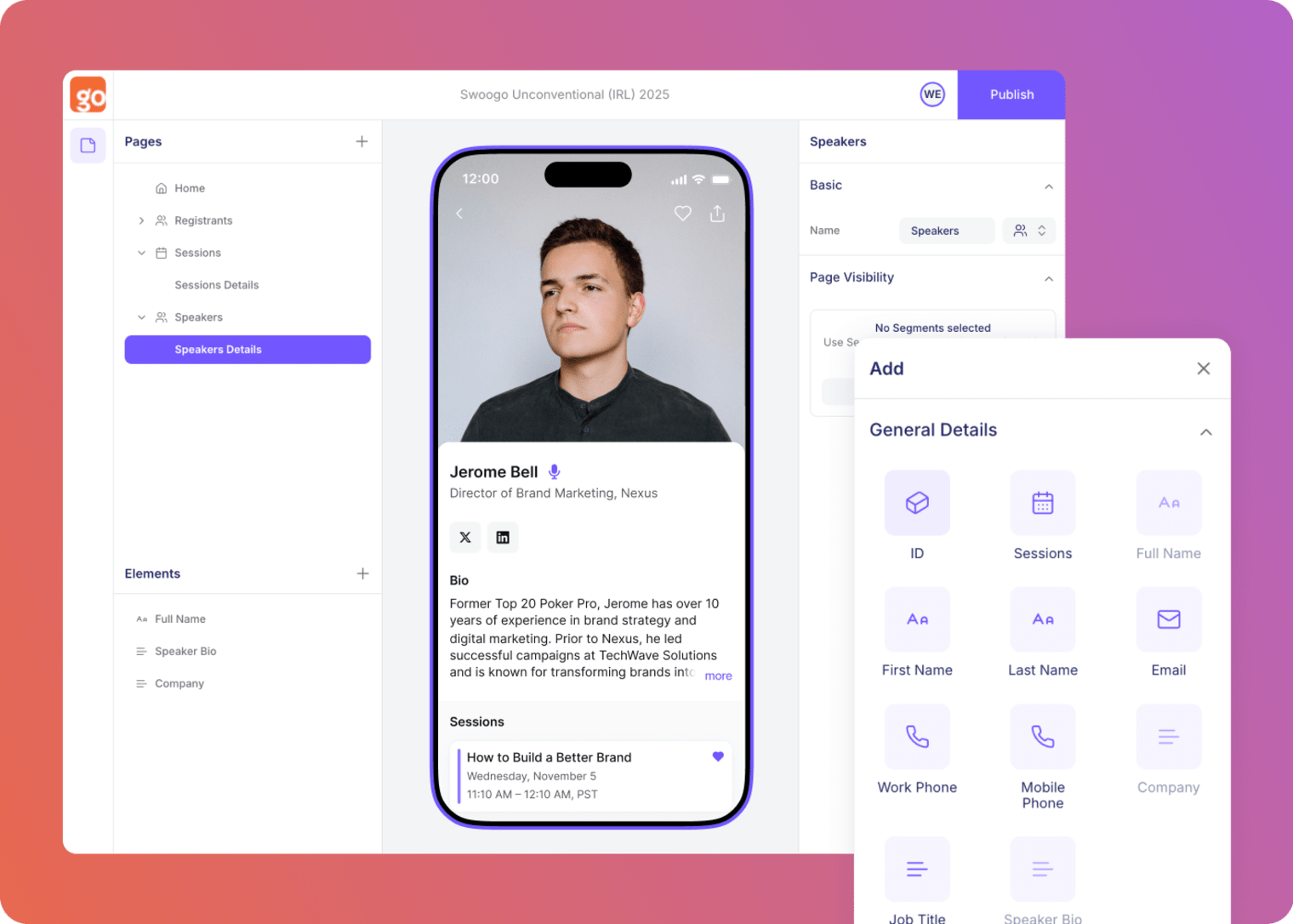Send push alerts for event-wide updates, or segment communications to specific attendees. Leverage details like registrant type, session selections, or registration responses to tailor your audience and get the message to exactly the right people at the right time.